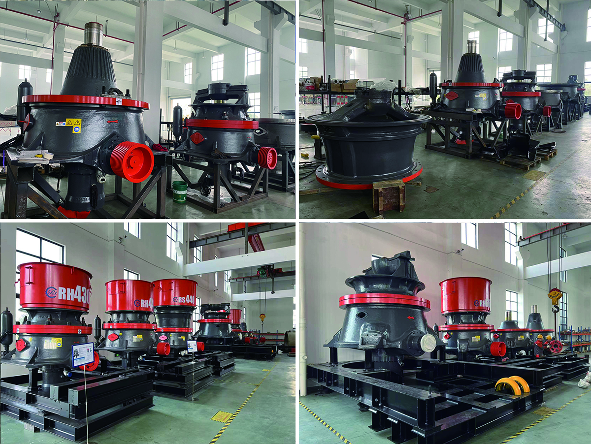 單缸液壓圓錐式破碎機主軸采用上下兩端支撐,在工作時,電機帶動破碎機的小齒輪,小齒輪帶動大齒輪,大齒輪組件(大齒輪、大齒輪架、偏心鋼套)帶動偏心套組件(偏心缸套、偏心銅套)和主軸組件(主軸、內(nèi)錐、內(nèi)錐襯板)以理論垂直線為中心,在銅襯套內(nèi)公轉(zhuǎn),主軸組件在偏心銅套內(nèi)以主軸的中心線可以實現(xiàn)自轉(zhuǎn)。當(dāng)物料進入到破碎腔后,主軸總成(主軸、內(nèi)錐)在物料的阻力下在偏心銅套內(nèi)緩慢的自轉(zhuǎn)。內(nèi)錐的運行軌跡看起來是在破碎腔內(nèi)來回擺動,同時緩慢的旋轉(zhuǎn)。物料被擺動的內(nèi)錐擠壓破碎。支撐套與架體連接處靠液壓缸壓緊,當(dāng)破碎機內(nèi)落入金屬塊等不可破碎物體時,單缸的動錐由底部液壓活塞托起,起到排放口調(diào)整和過鐵保護、反復(fù)起落排除堵礦的作用。